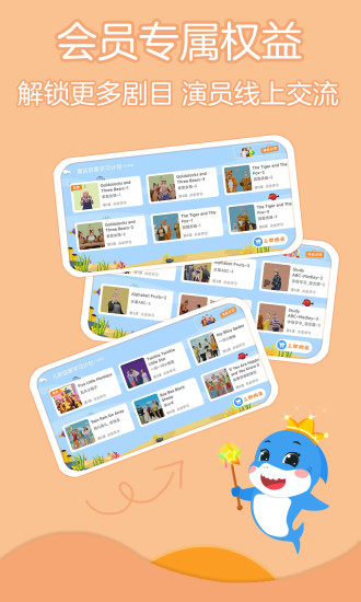 1、原创IP形象“泡泡鲨鱼”是APP的灵魂角色。这只戴着潜水镜的卡通鲨鱼以幽默、友善的形象贯穿所有动画,通过夸张的表情和动作传递语言点。例如,在教“happy”和“sad”时,泡泡鲨鱼会通过跳舞或耷拉耳朵的表现让孩子直观理解情绪词汇,比传统卡片教学更生动。