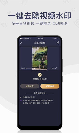 2、多格式支持:兼容JPG、PNG、MP4、MOV等主流图片与视频格式,无论是静态图还是动态视频,均能实现无损去水印。处理后的文件可直接保存至相册或分享至社交平台,省去格式转换的麻烦。