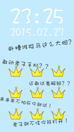 1、**动态恶搞素材库**:APP内置海量搞怪素材,包括会眨眼的卡通角色、突然弹出的鬼脸动画、以及“系统崩溃”“电量不足”等伪故障提示。用户可自由组合这些元素,设置在解锁瞬间触发,例如滑动解锁时突然弹出“你的手机已被外星人接管”的弹窗,制造意外笑点。