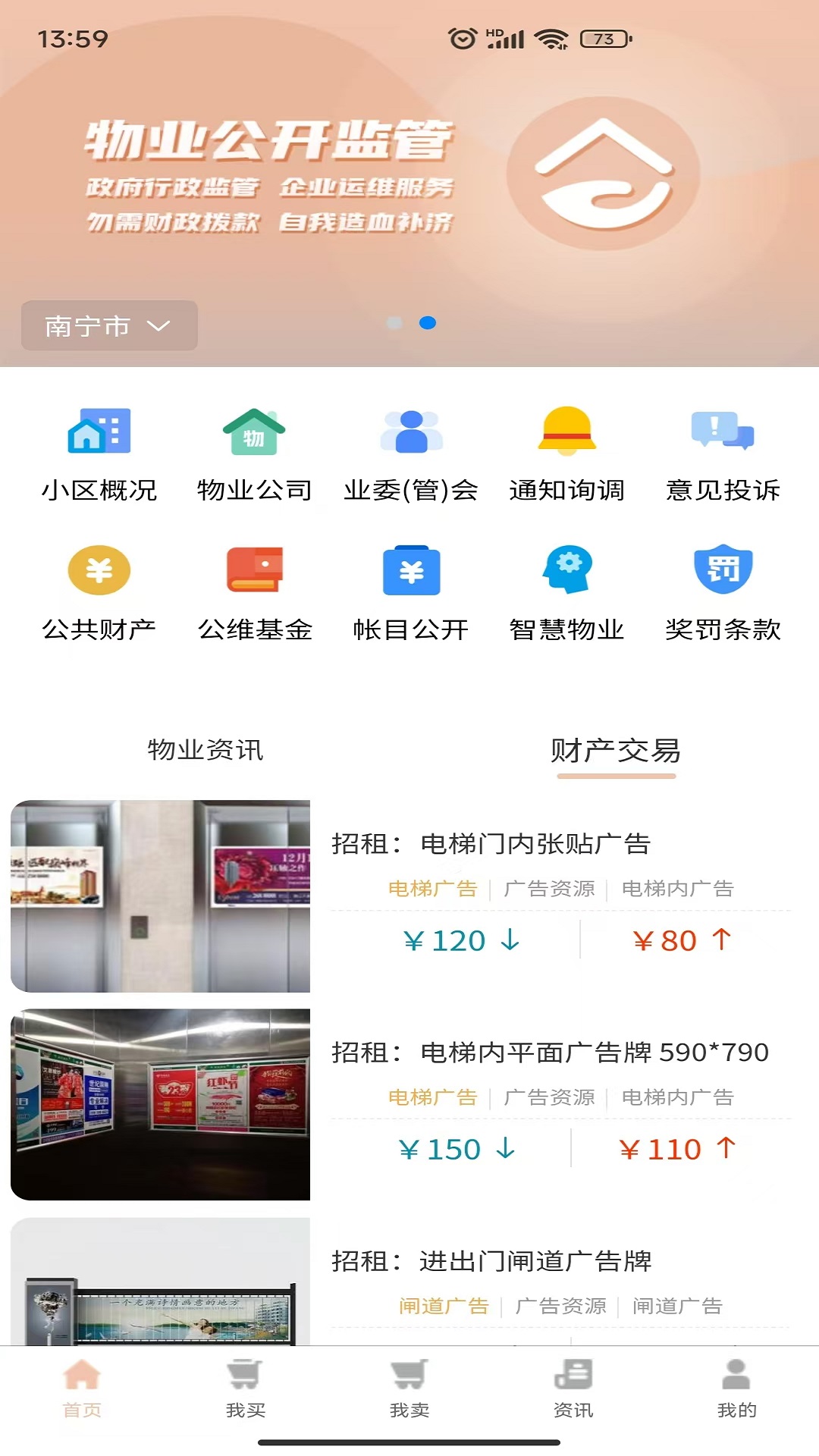 2、**财产交易与广告管理**:平台提供电梯广告位、停车场、场馆等公共资源的在线招租与租赁服务。物业可发布广告位信息,租户通过筛选类型、位置等条件快速匹配需求,交易记录实时保存,支持在线审核与合同管理,提升资源利用率与收益。