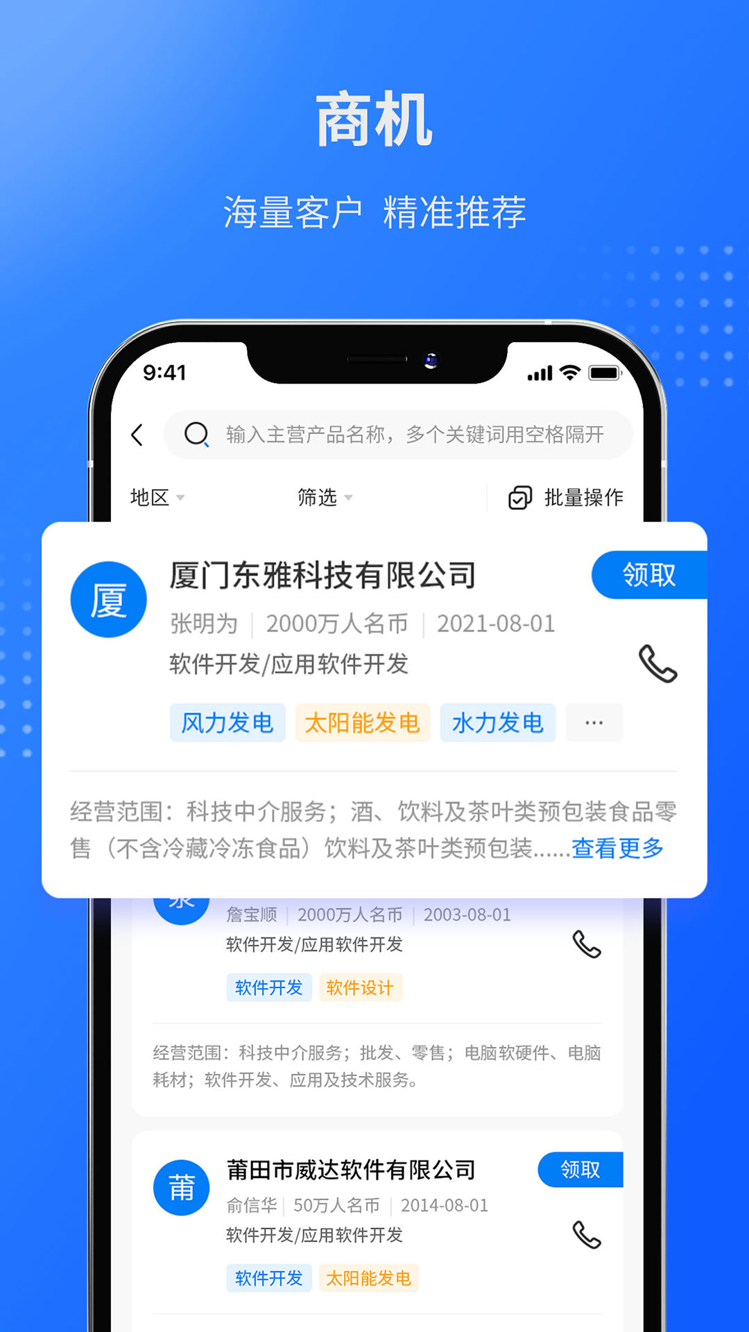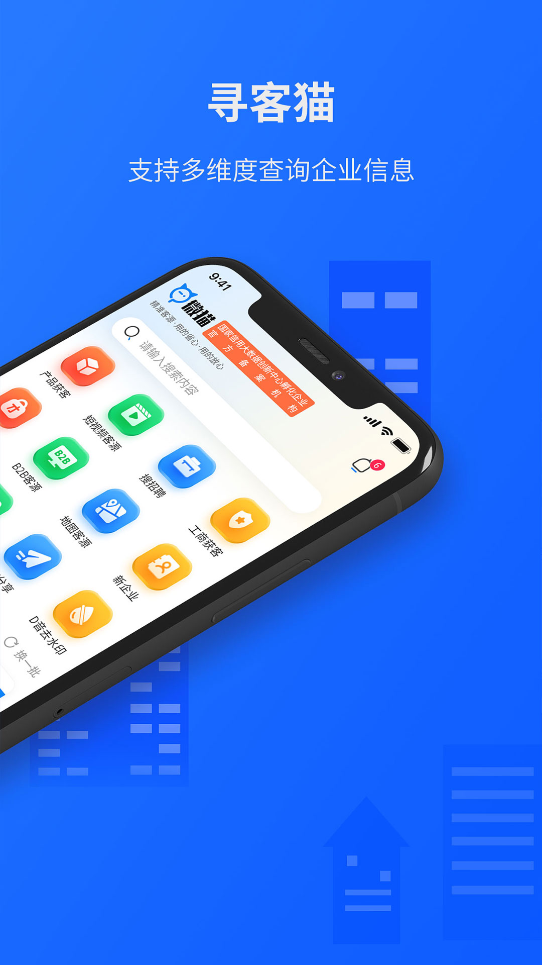 2、**智能客户管理**:应用内置“推客猫”“寻客猫”“猫管家”三大模块,支持自定义客户画像(如行业、规模、地域)、一键同步联系方式、标签化管理及跟进状态追踪。用户可设置100家企业动态监控,实时接收企业变更提醒(如法人更换、股权调整),辅助决策。
