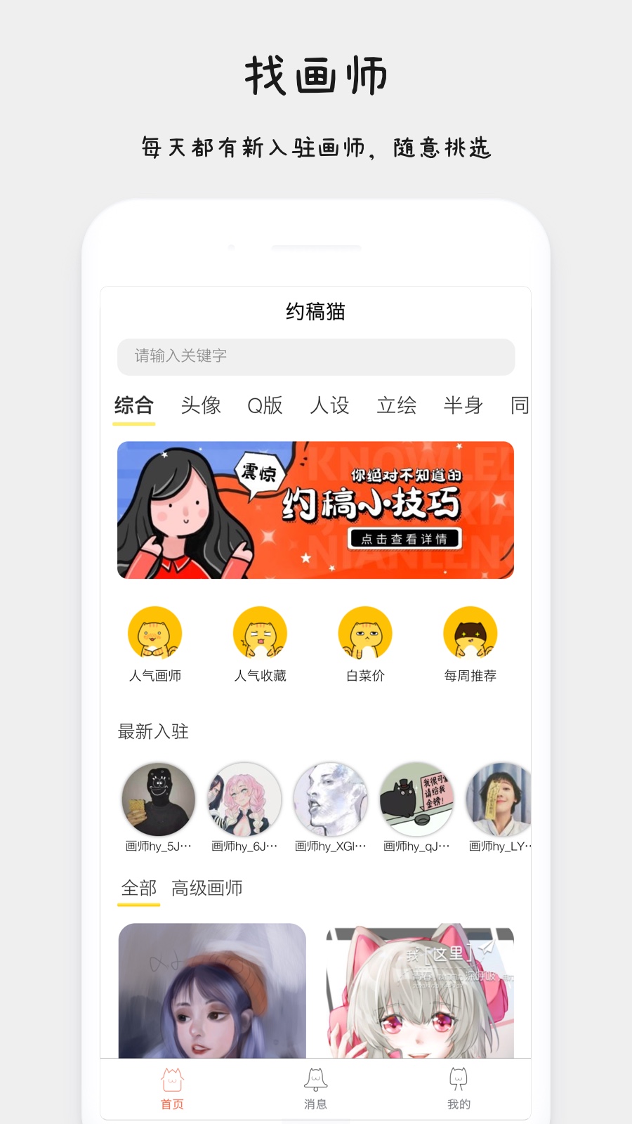 1、**画师资源库与作品筛选**:平台将画师按风格、人气、价格等维度分类管理,用户可通过关键词搜索或浏览“白菜价专区”“新入驻画师”等板块快速定位目标。例如,用户需定制日系动漫头像时,可直接筛选擅长该风格的画师,查看其历史作品与报价,避免无效沟通。