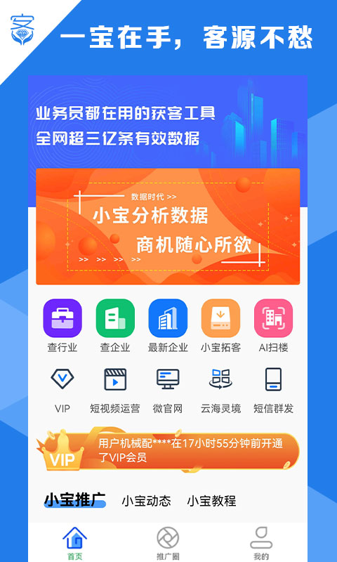 客源小宝是一款基于大数据技术的智慧化获客工具,专为中小企业及个体商户设计,集行业客户搜索、精准营销、内容推广等功能于一体。通过整合全网公开商业数据,覆盖家装、金融、电商、教育等300余个行业品类,用户可快速获取超3.8亿条企业及商户信息。其核心价值在于通过智能算法实现客户画像精准匹配,结合自动化营销工具降低获客成本,帮助用户实现从客户搜索到成交转化的全流程管理。平台支持多维度筛选(如行业、地域、注册时间),并提供一键导出通讯录、短信群发等实用功能,已服务超400万用户,成为企业数字化转型的重要工具。