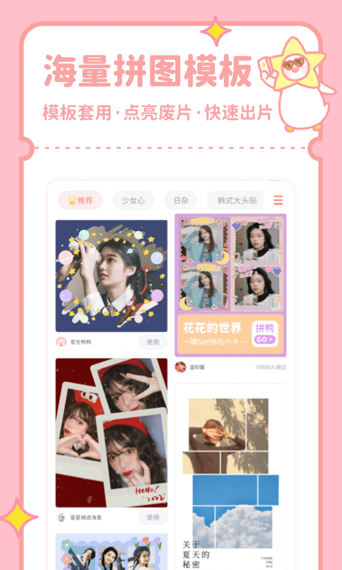 3、拼图鸭相机构建了“官方原创+用户共创”的素材生态。用户上传的优质模板经设计师修改后,可进入“使用同款”功能库,供其他用户一键调用。例如,某用户设计的“旅行手账”模板被采纳后,获得鸭币奖励并用于兑换线下打印服务。这种模式既降低了创作门槛,又激发了用户参与感。