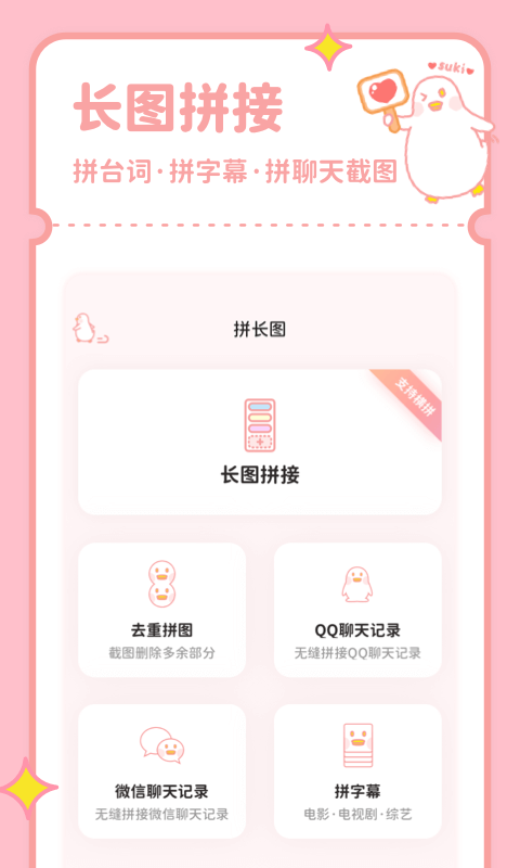 1、拼图鸭相机的核心功能围绕“多图创意组合”展开。其智能拼接技术可自动识别微信、QQ聊天记录的对话气泡,或电影截图的时间轴,将分散内容整合为长图,节省手动调整时间。例如,用户可将旅行中的聊天记录与景点照片拼接,生成“故事线长图”。此外,自由拼图模式支持9张图片的个性化布局,用户可自由调整比例、边框、滤镜及贴纸,实现从“九宫格”到“不规则碎片”的多样化呈现。