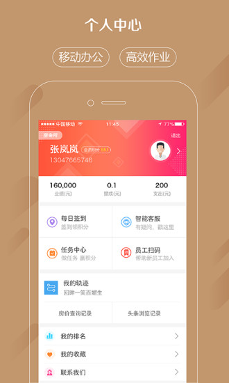 2、**实时数据与决策支持**:平台提供“查房价”功能,覆盖全国主要城市房价数据及评估工具,辅助业务人员快速报价。同时,“业绩排名”模块展示个人及团队绩效,结合“我的”页面中的邀请新员工、扫一扫加入公司等功能,形成内部竞争与协作机制,提升团队效率。
