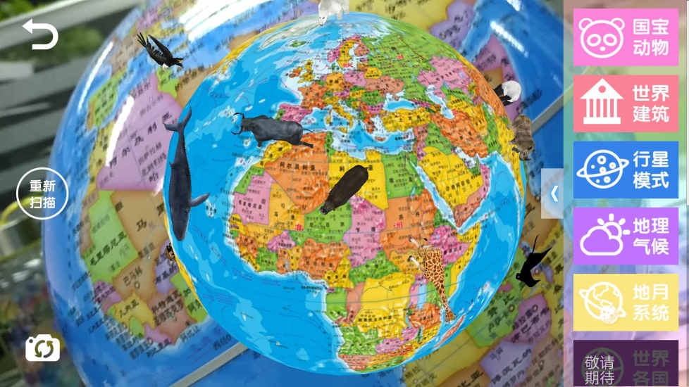 1、核心功能包括AR动态扫描,用户对准实体地球仪任意区域,即可触发3D地形投影,如喜马拉雅山脉的立体起伏、亚马逊雨林的植被覆盖等,配合语音解说与文字标注,直观呈现地理特征。例如扫描非洲大陆时,APP会同步显示撒哈拉沙漠的沙丘流动动画与尼罗河的流域走向。