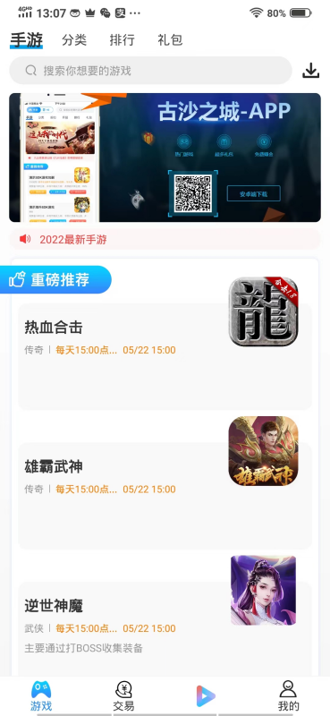 1、**全类型游戏资源库**:古沙之城覆盖传奇类、角色扮演类、策略类等十余种手游类型,支持BT版、破解版等特殊版本下载。平台每日更新30+款新游,用户可通过分类标签快速筛选,例如“高爆率传奇”“怀旧经典”等,满足不同玩家需求。