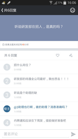 1、职场问答社区是「职说」的核心功能之一。用户可发布职场难题,如职业规划、面试技巧、职场人际关系等,由行业专家或资深从业者提供专业解答。这种“众包式”的解决方案,既保证了回答的权威性,又能通过多视角讨论帮助提问者全面理解问题。