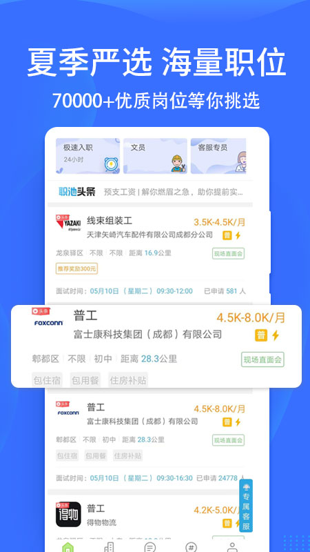 3、全流程服务:从简历优化、岗位推荐到面试预约、入职跟进,APP提供一站式服务。用户可上传简历模板,系统自动生成优化建议;面试前可查看企业环境照片、员工评价;入职后还能收到职场适应指南,帮助快速融入团队。