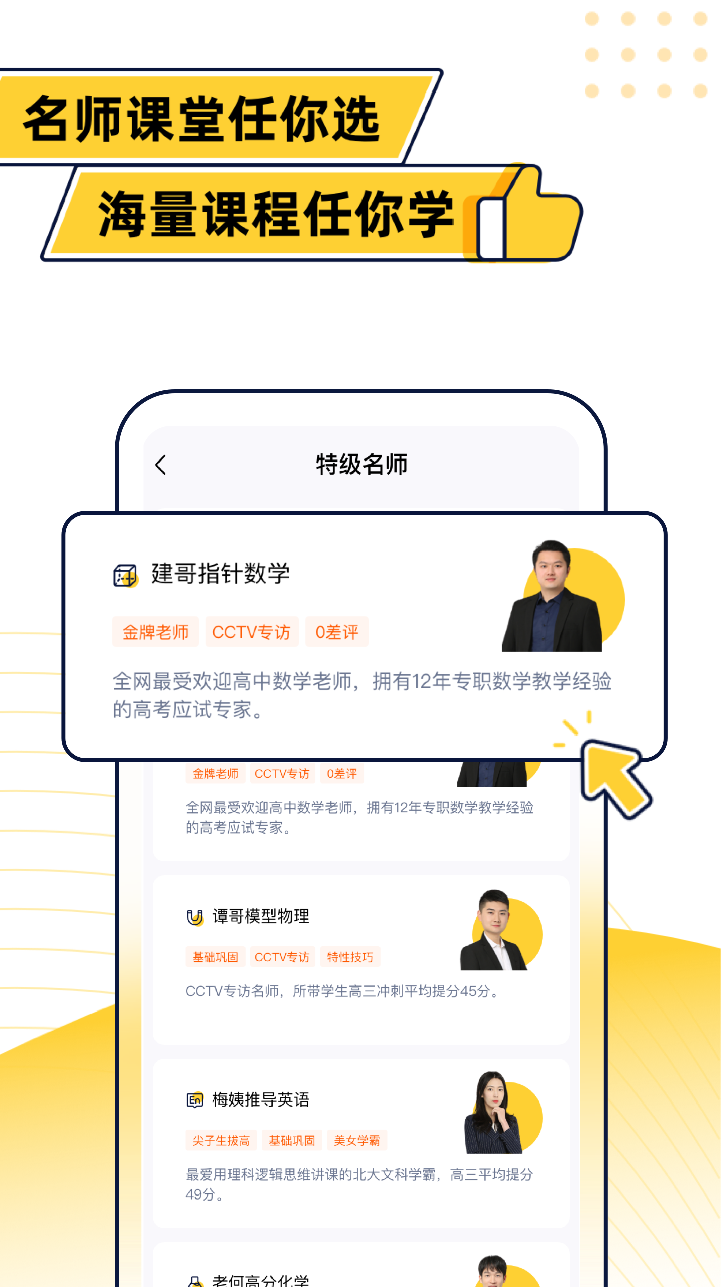 1、**名师IP化运营**:蹊径课堂以独立IP形式打造名师品牌,如“建哥指针数学”“谭哥模型物理”等课程,主讲教师均拥有10年以上教龄,教学风格鲜明。例如,物理教师谭哥通过“模型拆解法”将复杂力学问题转化为生活场景,帮助学生快速理解。