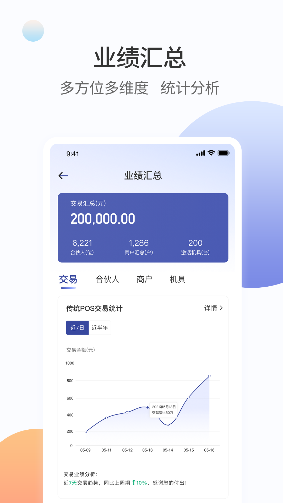 3、数据分析看板集成交易总额、笔均金额、区域分布等12项核心指标,支持按日/周/月自定义报表。系统通过AI算法预测下月收益趋势,误差率控制在3%以内,为展业策略调整提供数据支撑。