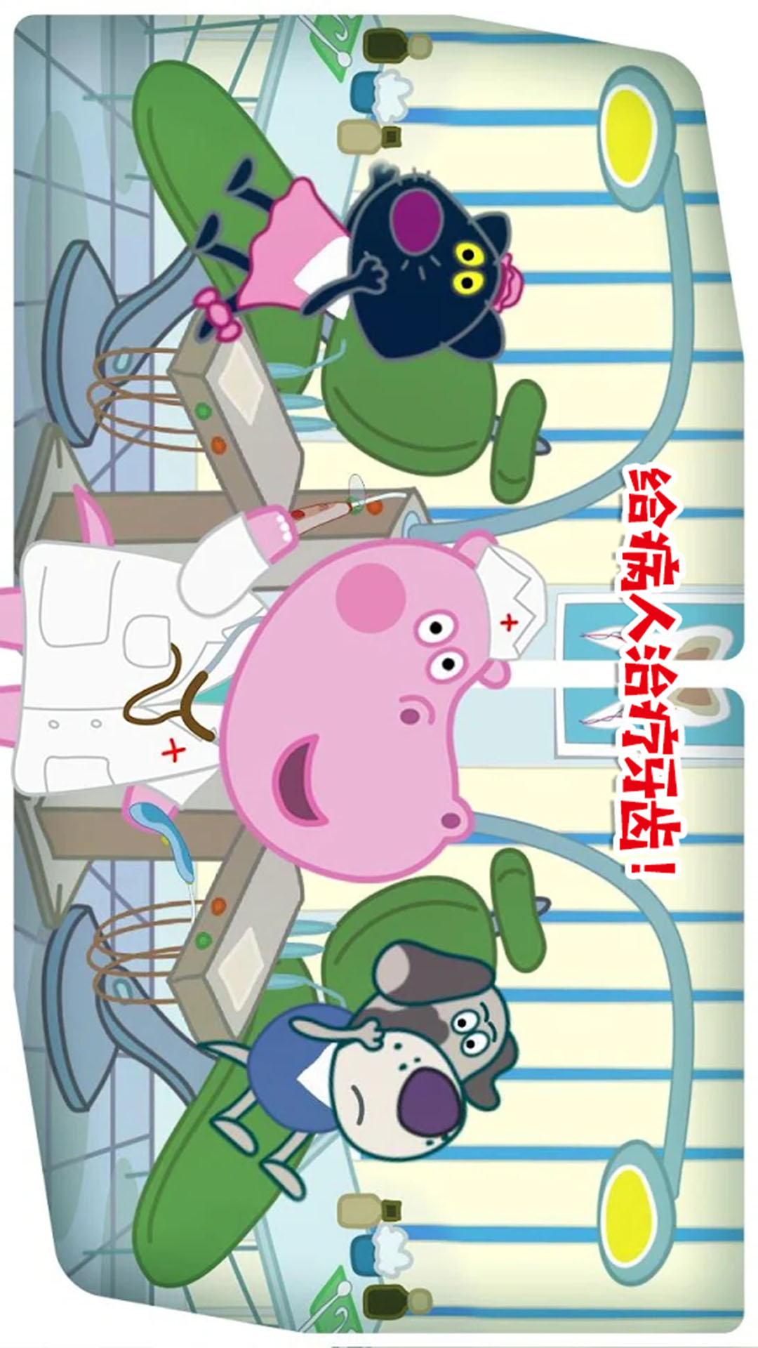 1、**IP联动沉浸体验**:游戏深度融入《小猪佩奇》动画元素,佩奇会作为助手协助整理器械,乔治则举着“牙齿健康”标语牌为玩家加油。治疗成功后,小动物们会跳起动画中的标志性舞蹈,增强IP粉丝的代入感。