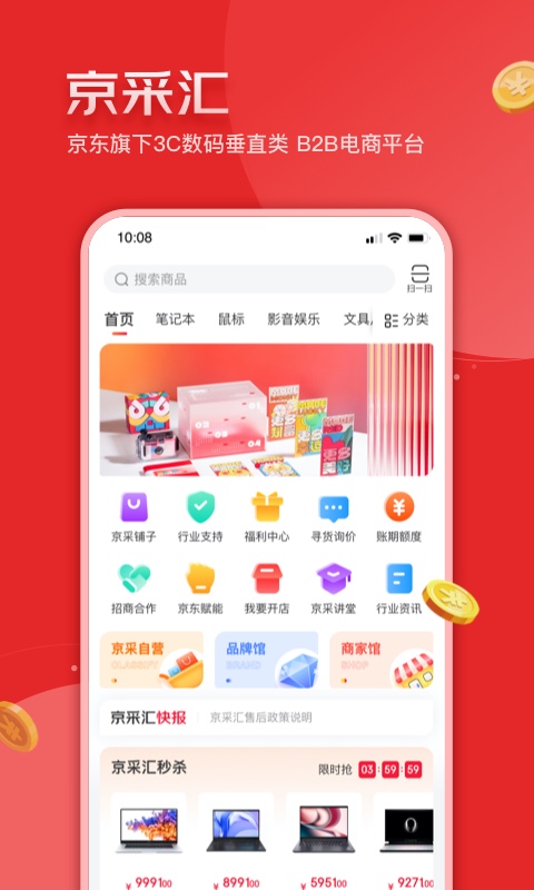 京采汇APP是京东集团专为3C数码行业打造的B2B垂直电商平台,依托京东在供应链、金融、物流等领域的核心资源,为全国数十万县镇级经销商提供无区域、无品类限制的批发交易服务。平台覆盖电脑整机、配件、办公设备等全品类数码产品,通过智能寻货系统、阶梯定价、企业金采等创新功能,帮助商家实现“一键开店、自由交易、安全买卖”。目前,平台已整合超万家优质品牌商,日均活跃买家突破10万,成为3C数码行业数字化转型的重要基础设施。