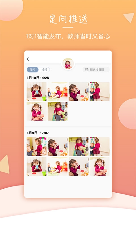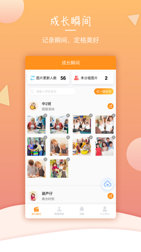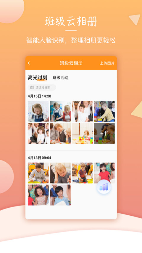 1、**智能相册管理**:教师上传幼儿照片或视频后,系统通过AI人脸识别自动匹配班级信息,生成个性化成长相册。例如,教师拍摄班级活动照片,上传后无需手动分类,系统可智能识别幼儿身份并归类至对应相册,家长登录即可查看自家孩子的动态。