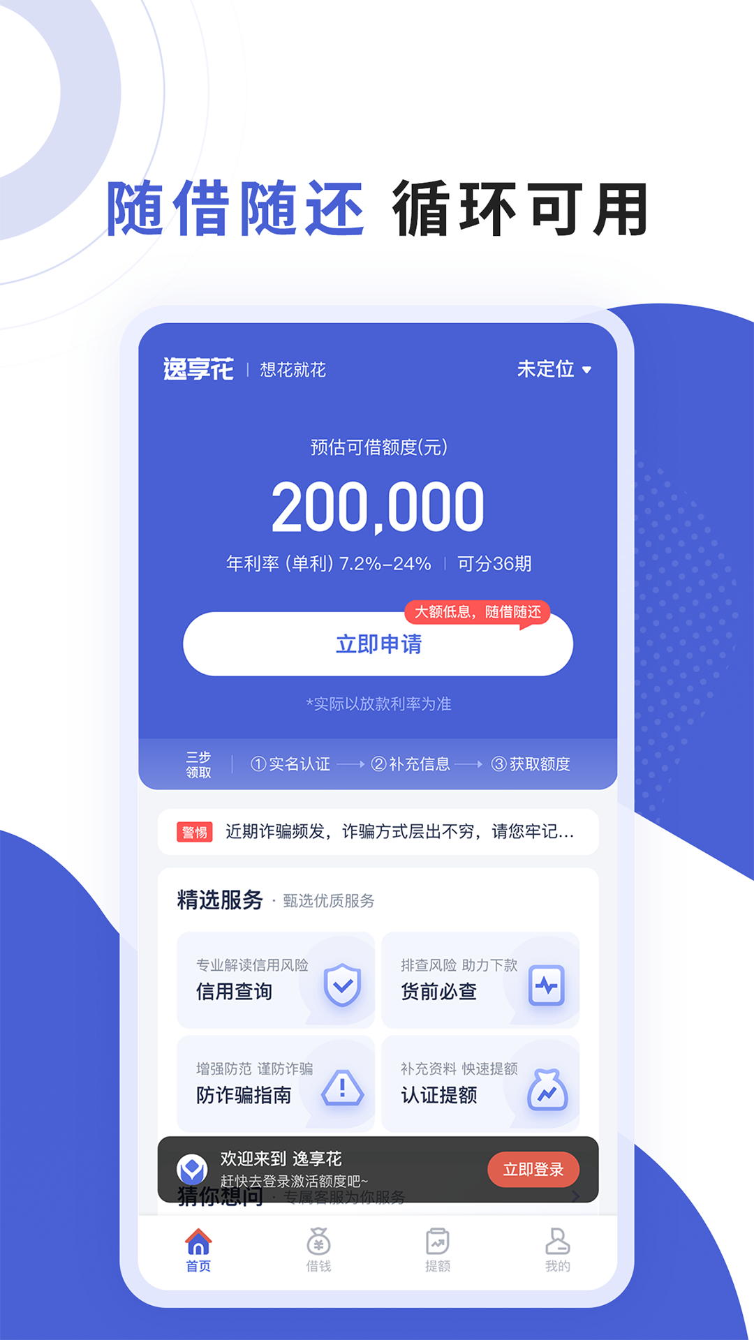 1、**全流程线上化操作**:逸享花APP集成智能填单系统,用户仅需上传身份证、绑定银行卡并填写基础信息,即可完成贷款申请。平台通过OCR识别技术自动填充信息,减少手动输入错误,审批结果实时推送至手机端,避免传统贷款“跑银行、等通知”的繁琐流程。