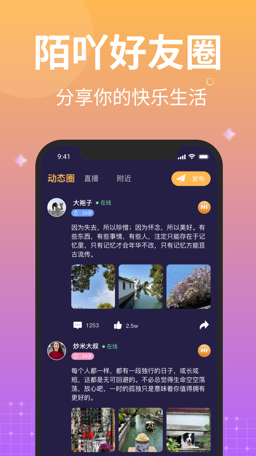 2、动态广场是陌吖的社交主阵地,用户可发布图文、短视频或语音动态,展示生活点滴。平台支持点赞、评论、转发等互动,用户还能通过“话题标签”参与热门讨论,如#周末去哪儿#、#美食探店#,增强社交粘性。
