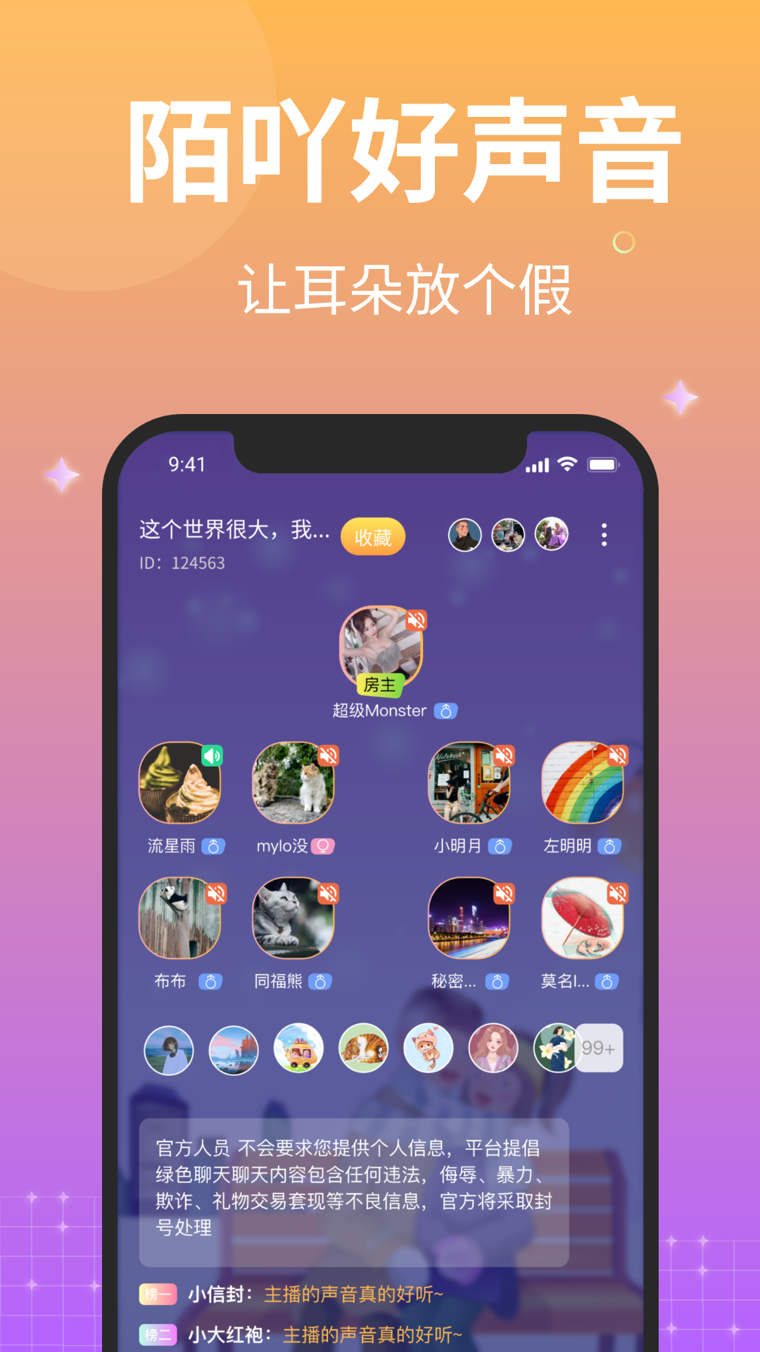 1、陌吖的“语音派对”功能支持多人语音连麦,用户可创建或加入主题房间,如K歌、讲故事、游戏开黑等。语音派对打破文字交流的局限,让社交更具沉浸感,尤其受年轻用户欢迎。