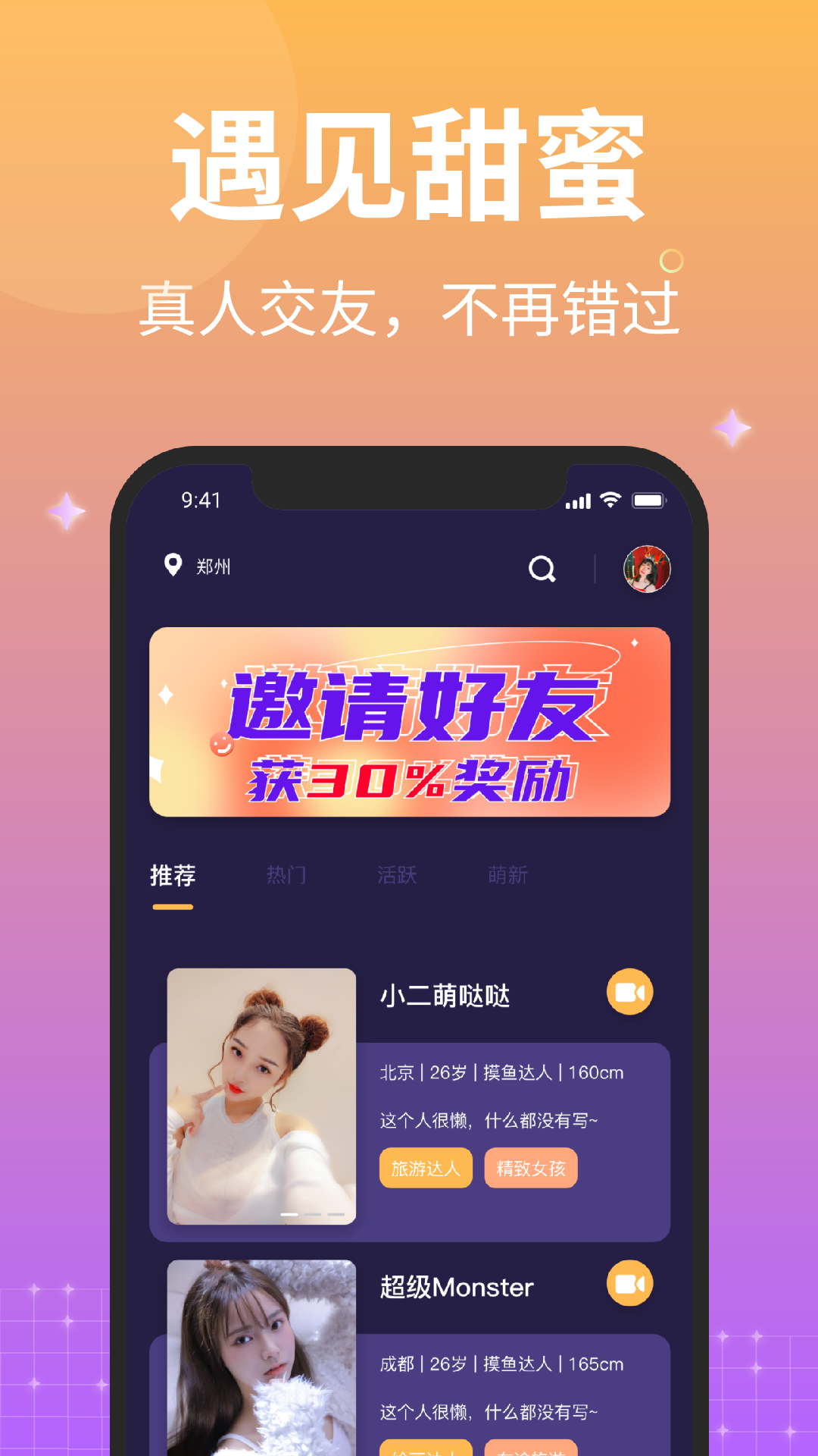 1、陌吖的核心功能之一是“兴趣匹配系统”,用户填写个人兴趣标签(如音乐、运动、旅行等)后,系统会通过算法推荐相似度高的用户,支持一键发起聊天或加入兴趣群组。例如,喜欢摄影的用户可快速找到同城的摄影爱好者,分享作品或约拍。
