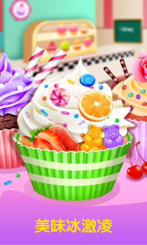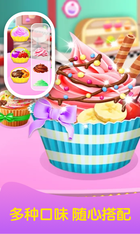 1、APP提供丰富的食材库,涵盖不同口味的冰淇淋、蛋糕胚、水果、巧克力等,孩子可根据喜好自由组合。每种食材均配有可爱的动画效果,点击后会展示名称和特点,帮助孩子认识食材。