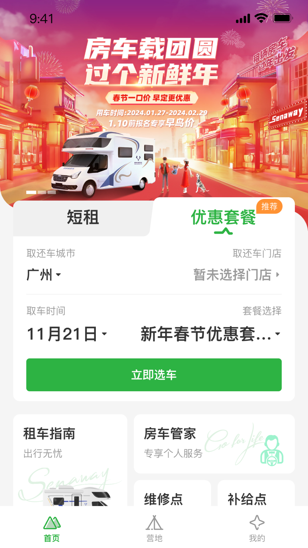 1、**供应链垂直整合**:作为赛纳威集团旗下平台,APP直接对接江西制造厂的房车生产资源,省去中间商环节,租赁价格较市场低20%-30%。例如,春节早鸟套餐(4天/7天/9天)含车辆整备费、服务费及租金,日均成本仅160元起,性价比远超传统旅行社。