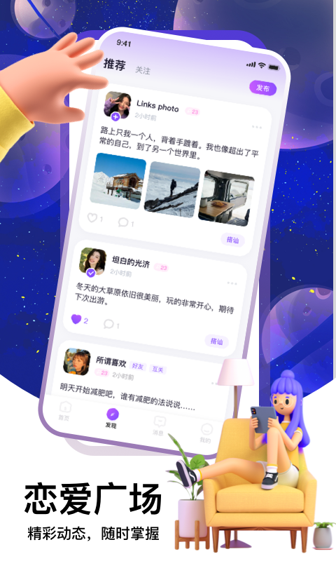 1、三维场景社交:用户可自由选择或设计虚拟场景(如日式茶室、未来城市),通过拖拽元素布置空间,并邀请好友以虚拟形象进入。场景内支持实时语音、表情动作同步,甚至能模拟握手、碰杯等肢体互动,让线上聊天突破“对话框”限制。