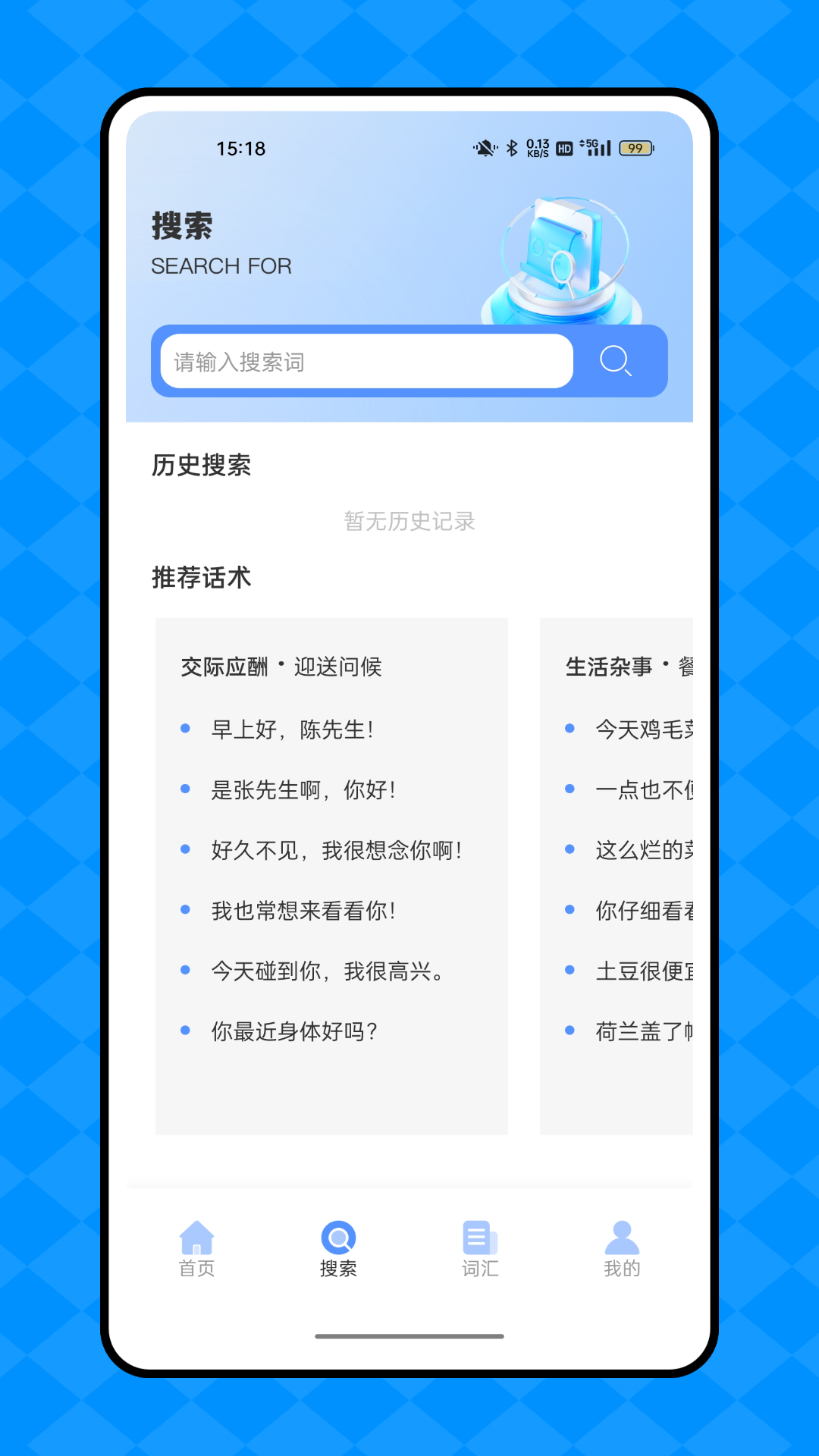 2、情景对话模拟:提供超市购物、问路指路、茶馆闲聊等20余个生活场景对话模板,用户可扮演不同角色进行互动练习。对话结束后,系统会从语法、用词、语调三方面评分,并生成学习报告,帮助用户针对性提升。