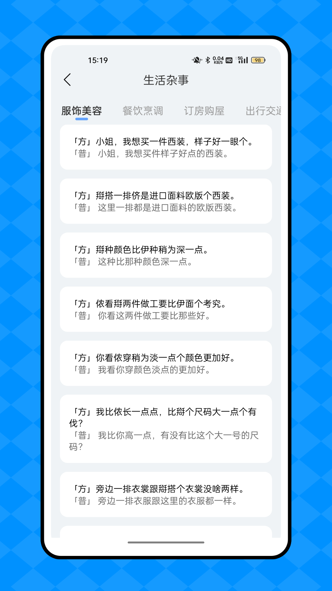 3、离线学习支持:所有课程音频、文本均可下载至本地,用户可在地铁、飞机等无网络环境下继续学习。此外,APP提供“方言急救包”功能,包含30个高频场景短语(如“多少钱”“往哪走”),方便用户临时查阅使用。