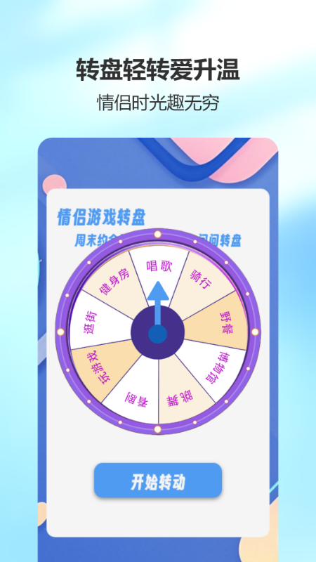 2、**趣味互动模块**:趣味转盘工具支持自定义选项,用户可设置“晚餐选择”“游戏惩罚”等场景,通过旋转转盘随机决策,增加生活趣味性。情侣游戏专区提供双人协作任务,如“默契问答”“合作绘画”,强化亲密关系。
