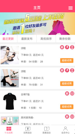 1、全品类试用覆盖:平台整合超过20个电商平台的商品资源,每日更新数千款试用商品,从千元级电子产品到日常消耗品均有覆盖。用户可通过分类筛选或关键词搜索快速定位目标商品,例如搜索“无线耳机”可同步显示天猫、京东的试用活动。