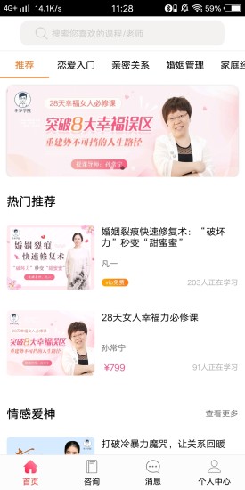 2、平台提供“成长课程体系”,涵盖亲密关系经营、情绪管理、职场沟通等主题,课程形式包括直播课、录播课及工作坊。用户可根据学习进度自由安排时间,并通过课后作业巩固知识,部分课程还提供结业证书,增强学习成就感。