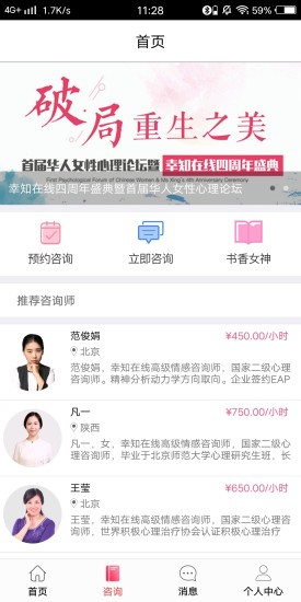 1、幸知在线的核心功能之一是“即时情感咨询”,用户可通过文字、语音或视频与认证咨询师实时沟通,系统根据问题类型自动推荐匹配度最高的专家,确保咨询的专业性与针对性。例如,面对突发情感危机时,用户可快速获得情绪疏导建议,避免问题恶化。