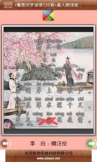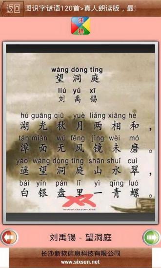 1、新软看图识字唐诗6的核心功能围绕“识图-认字-学诗”展开。看图识字模块中,孩子可通过点击图片中的物体(如“花”“鸟”“树”),同步显示汉字的书写笔顺和拼音,并播放标准发音,帮助孩子建立“实物-图像-文字”的认知链条。