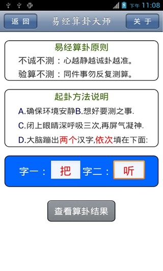 《易经算卦大师》是一款深度融合传统易学智慧与现代数字技术的专业占卜预测应用。该软件以宋代易学泰斗邵康节所创的梅花易数为核心算法,用户仅需输入两个汉字即可快速生成卦象,结果涵盖吉凶判断、趋势分析及行动建议。其界面设计简洁直观,操作流程符合现代用户习惯,既保留了《易经》六十四卦的哲学深度,又通过数字化手段降低了占卜门槛。无论是日常决策参考,还是对传统文化感兴趣的探索者,均可通过这款应用获得兼具趣味性与实用性的体验。