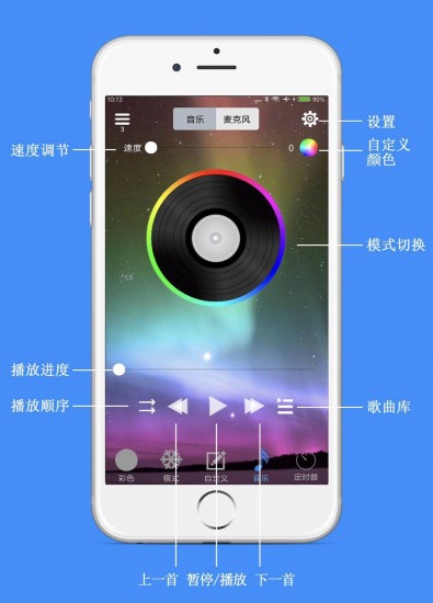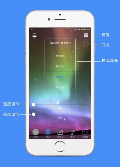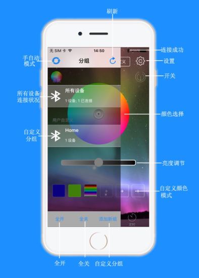 1、极简操作界面设计让新手也能快速上手。主界面采用卡片式布局,设备控制、效果选择与场景设置一目了然,滑动与点击操作符合手机使用习惯,无需复杂学习成本。