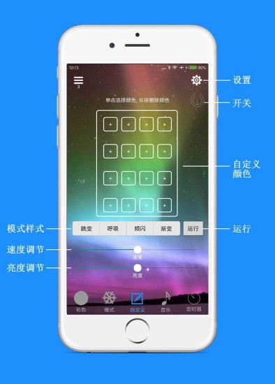 2、灯光效果定制是APP的亮点之一,用户可通过色轮选择任意颜色,调整亮度与饱和度,或从预设的“极光”“流星”“赛博朋克”等主题中快速应用。更支持动态效果编辑,如设置渐变速度、闪烁频率等参数。