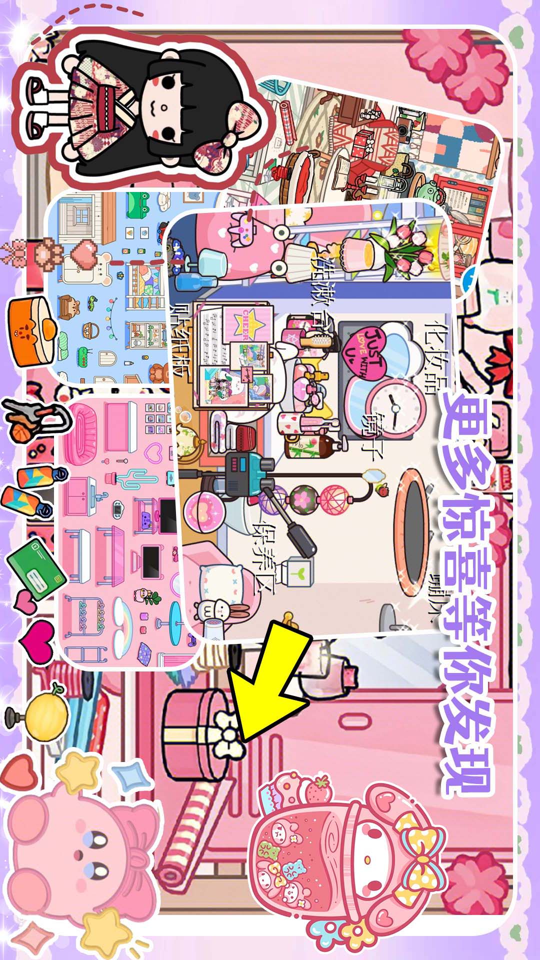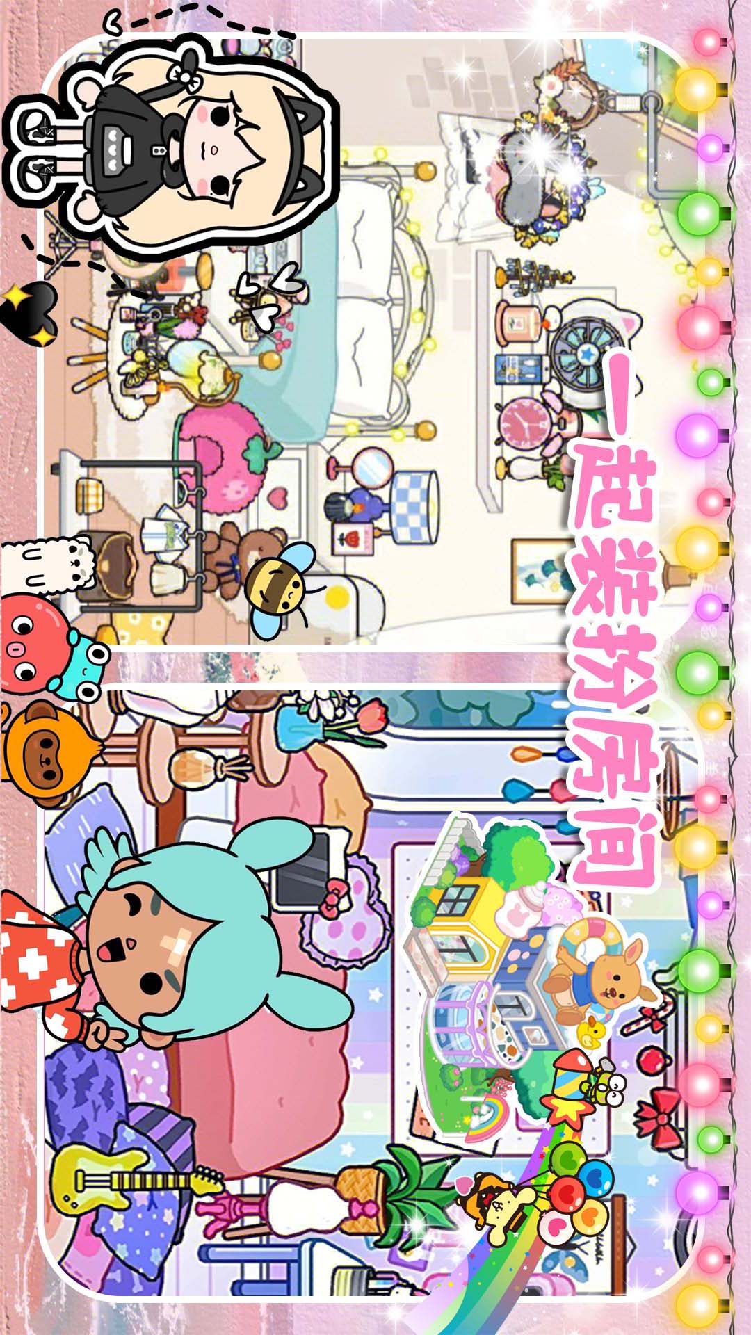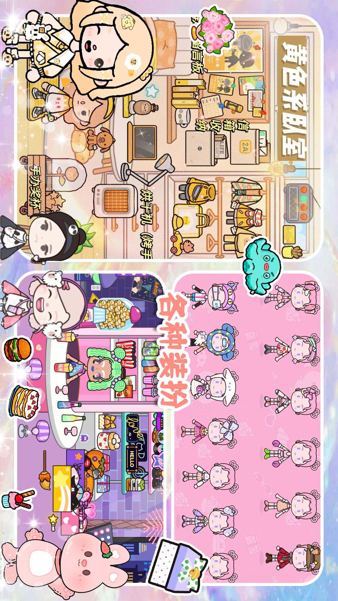 2、场景互动玩法:游戏内提供数十个可交互的场景,如厨房可烹饪美食、卧室可布置家具、学校可参与课堂活动。每个场景均隐藏着趣味彩蛋,例如点击书架可能触发隐藏故事,或通过组合物品解锁新道具。