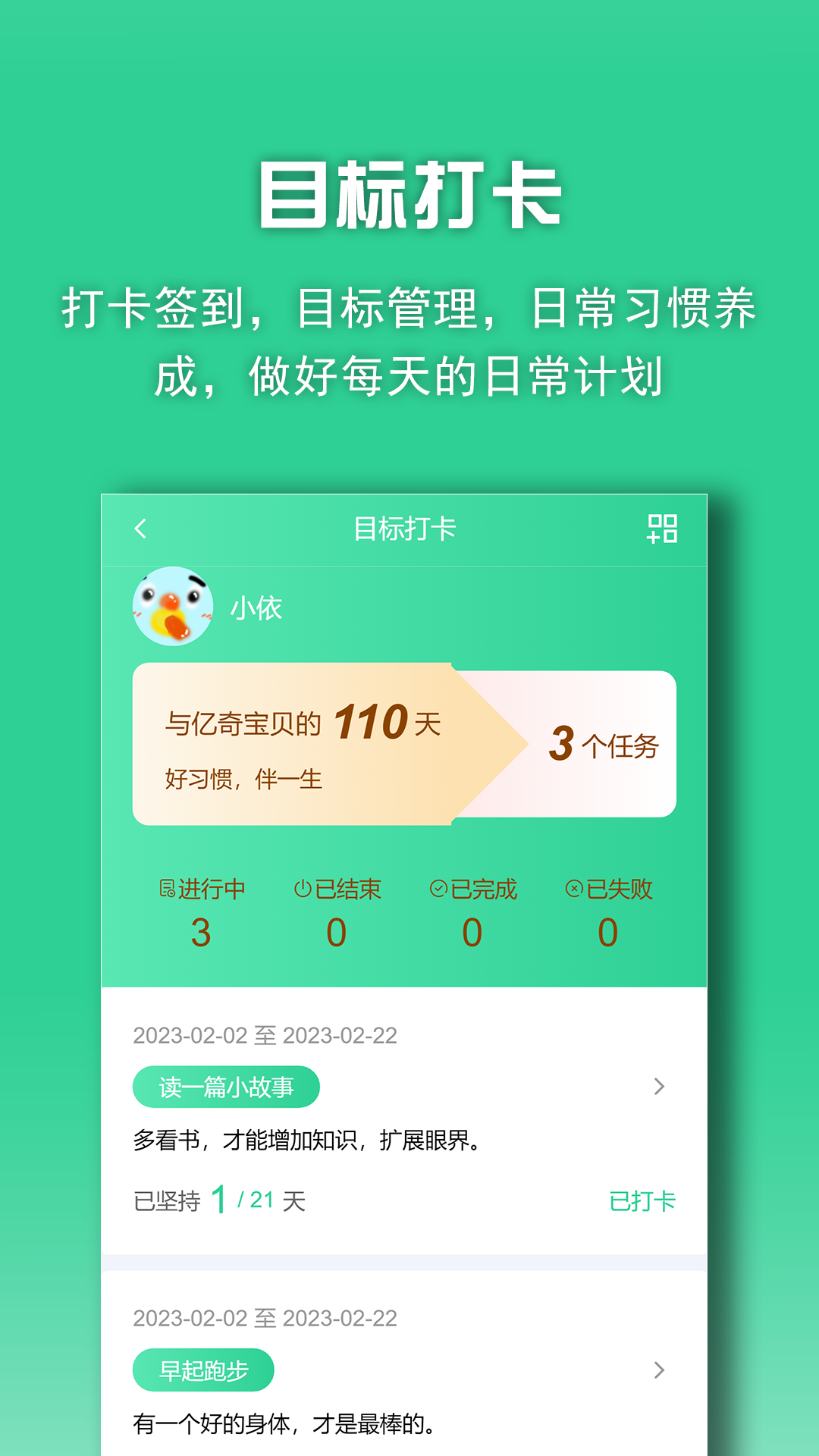 1、**目标打卡与习惯养成**:应用内置“目标打卡”模块,家长可为孩子设定每日任务(如刷牙、阅读、运动),通过打卡签到机制培养时间管理能力。例如,用户可设置“每天20分钟绘本阅读”目标,系统自动生成进度条,完成7天后解锁成就徽章,增强孩子成就感。