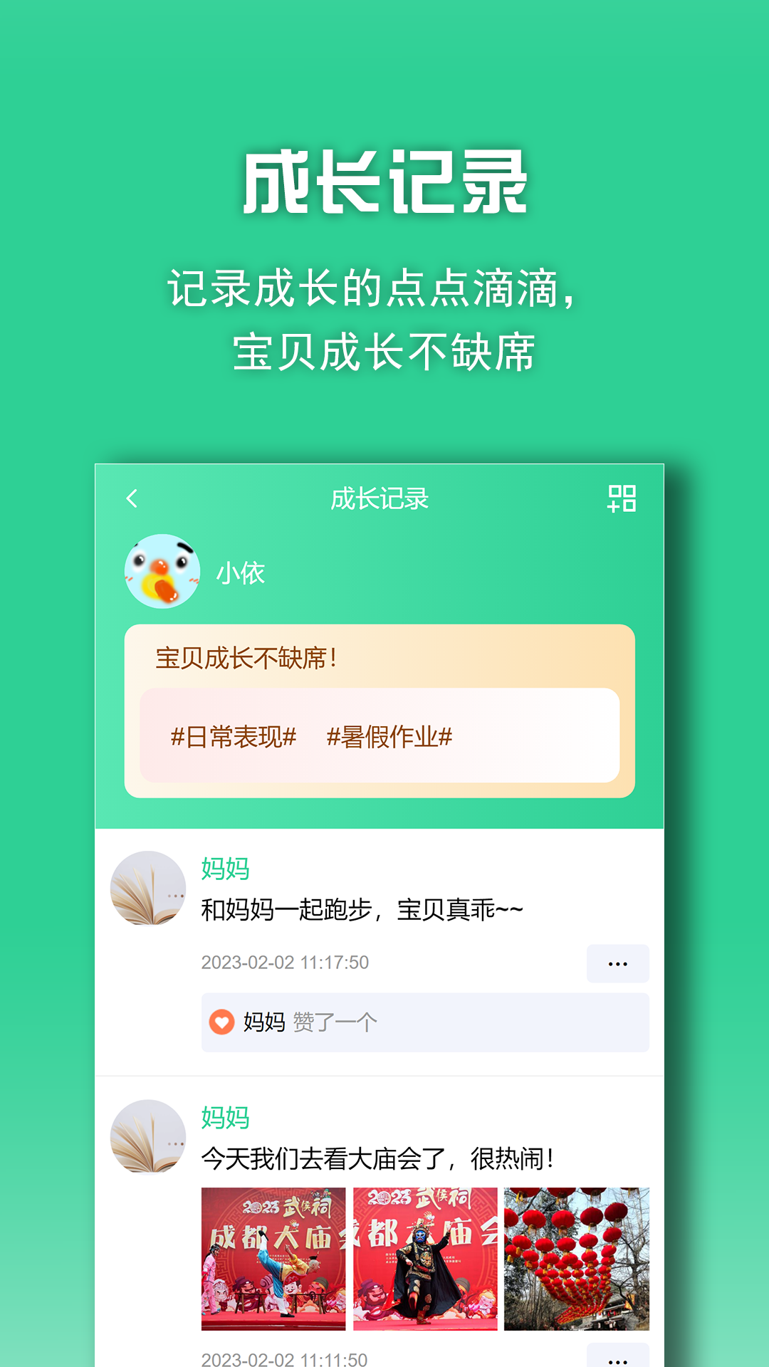 2、**成长记录与大事记**:“成长记录”功能支持按时间轴分类存储文字、图片、视频,用户可标注身高体重、疫苗接种等关键信息。而“大事记”模块则专为记录里程碑事件设计,如首次走路、生日派对等,系统自动生成时间轴相册,支持添加语音备注,让回忆更具温度。