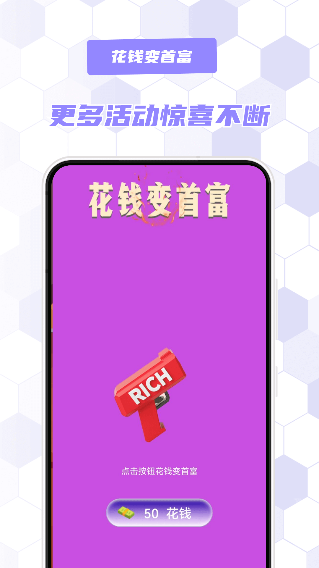 “花钱变首富”是一款以财富积累为核心的模拟经营类APP,灵感源自电影《西虹市首富》中“一月花光十亿”的经典设定。玩家通过无限资金自由消费、投资、创业,体验从普通人逆袭为商业巨擘的全过程。游戏融合了房产购置、股票交易、奢侈品收藏、慈善捐赠等多元化玩法,并加入随机事件系统(如市场波动、政策变化)增加策略深度。玩家需在“挥金如土”与“理性投资”间平衡,最终通过多元化布局实现财富最大化。游戏支持离线收益、成就排行榜、皮肤定制等功能,并设置真实红包奖励机制,让玩家在虚拟经营中收获现实成就感。