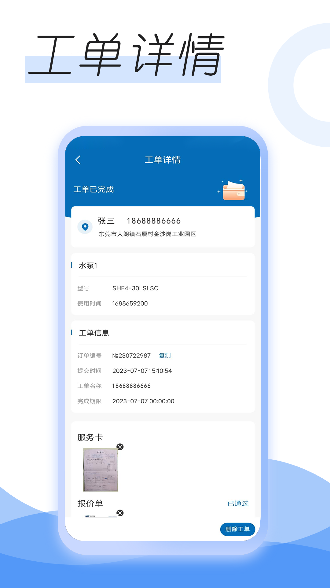 1、工单全流程管理:智享维修端提供从接单到完成的闭环管理功能。维修师傅可通过“工单列表”实时查看所有待处理任务,支持按状态、时间、类型等多维度筛选;通过“工单详情”页面可浏览故障描述、客户信息、历史维修记录等关键数据;完成服务后,师傅需上传服务现场照片并通过“服务打卡”功能提交工单,系统自动生成电子服务报告,确保流程可追溯。