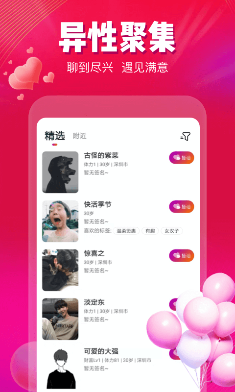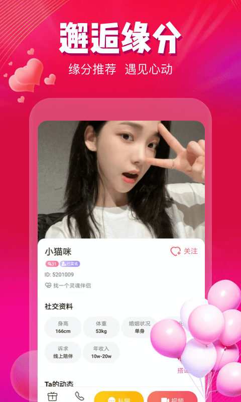“甜蜜伴侣”是一款专注于为单身用户打造优质社交体验的APP,致力于通过智能匹配与互动玩法,帮助用户快速找到志趣相投的伴侣。平台以“真诚、安全、高效”为核心,结合大数据分析与个性化推荐,为用户提供精准的交友服务。无论是寻找长期伴侣还是轻松社交,用户都能在这里找到属于自己的甜蜜缘分。界面设计简洁清新,操作流畅,同时严格审核用户信息,确保交友环境的安全与真实,让每一次互动都充满期待。