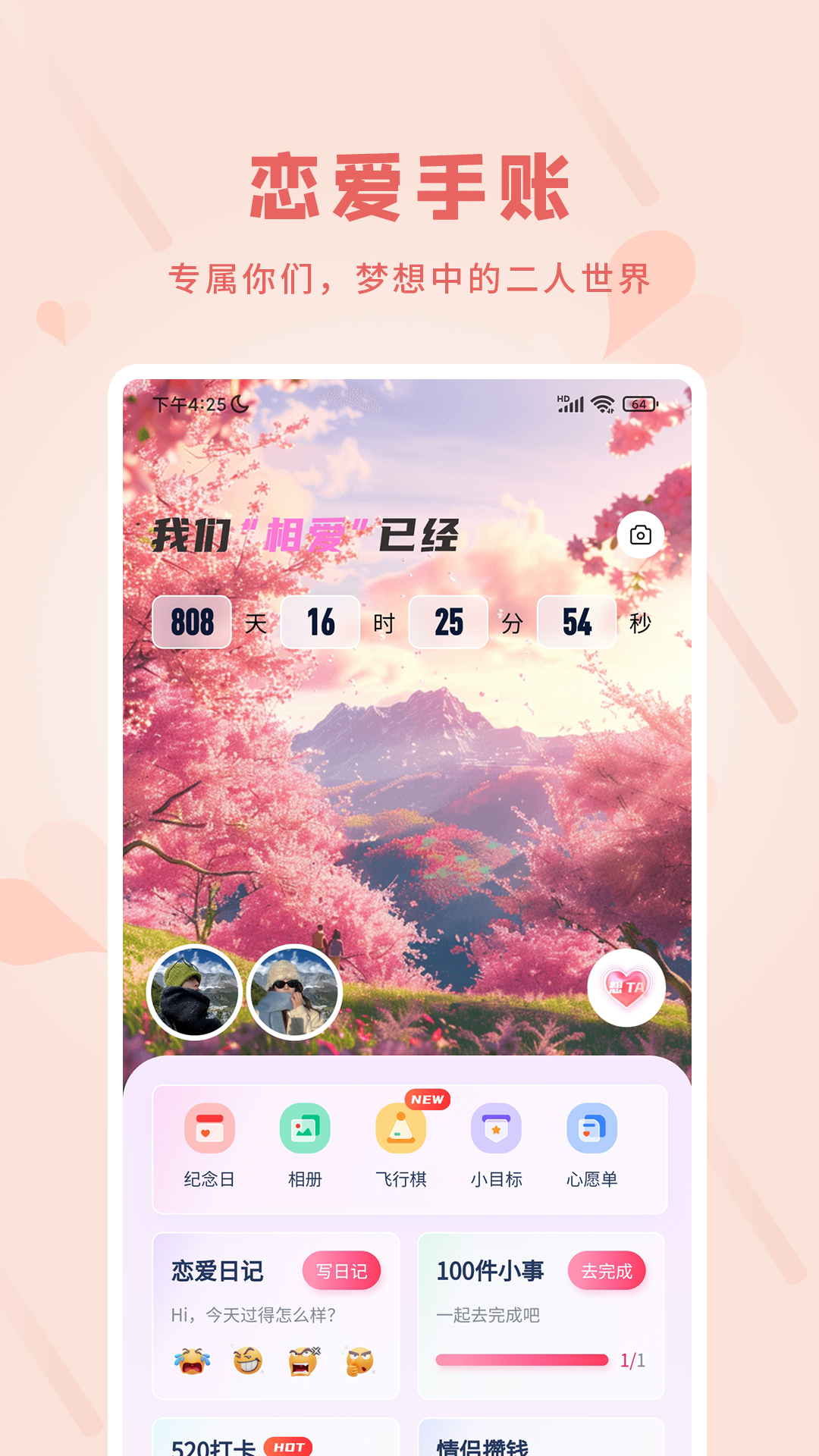 3、智能提醒系统:内置恋爱日历可设置纪念日、生日等重要日期,提前推送提醒。更有趣味功能如“恋爱任务”,系统会根据恋爱阶段推荐互动建议(如“一起做顿饭”“写封情书”),帮助用户维持新鲜感。