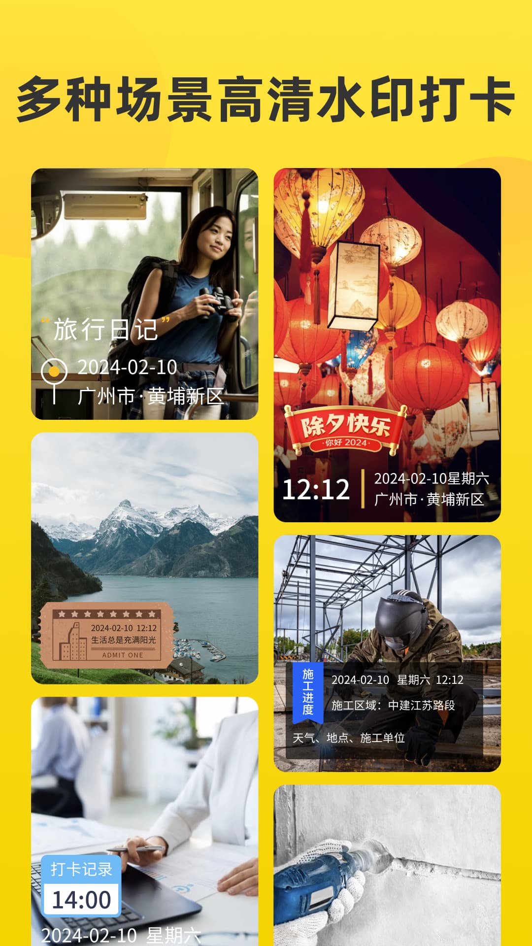 1、**多场景水印模板库**:提供时间地点、经纬定位、天气状况、节日主题、物流跟踪等20余类水印模板,覆盖考勤打卡、工程管理、旅游记录、微商宣传等场景。例如,建筑工地可通过“时间+经纬度+工程名称”水印实时记录施工进度,微商可添加“产品名称+价格+日期”水印防止图片盗用。
