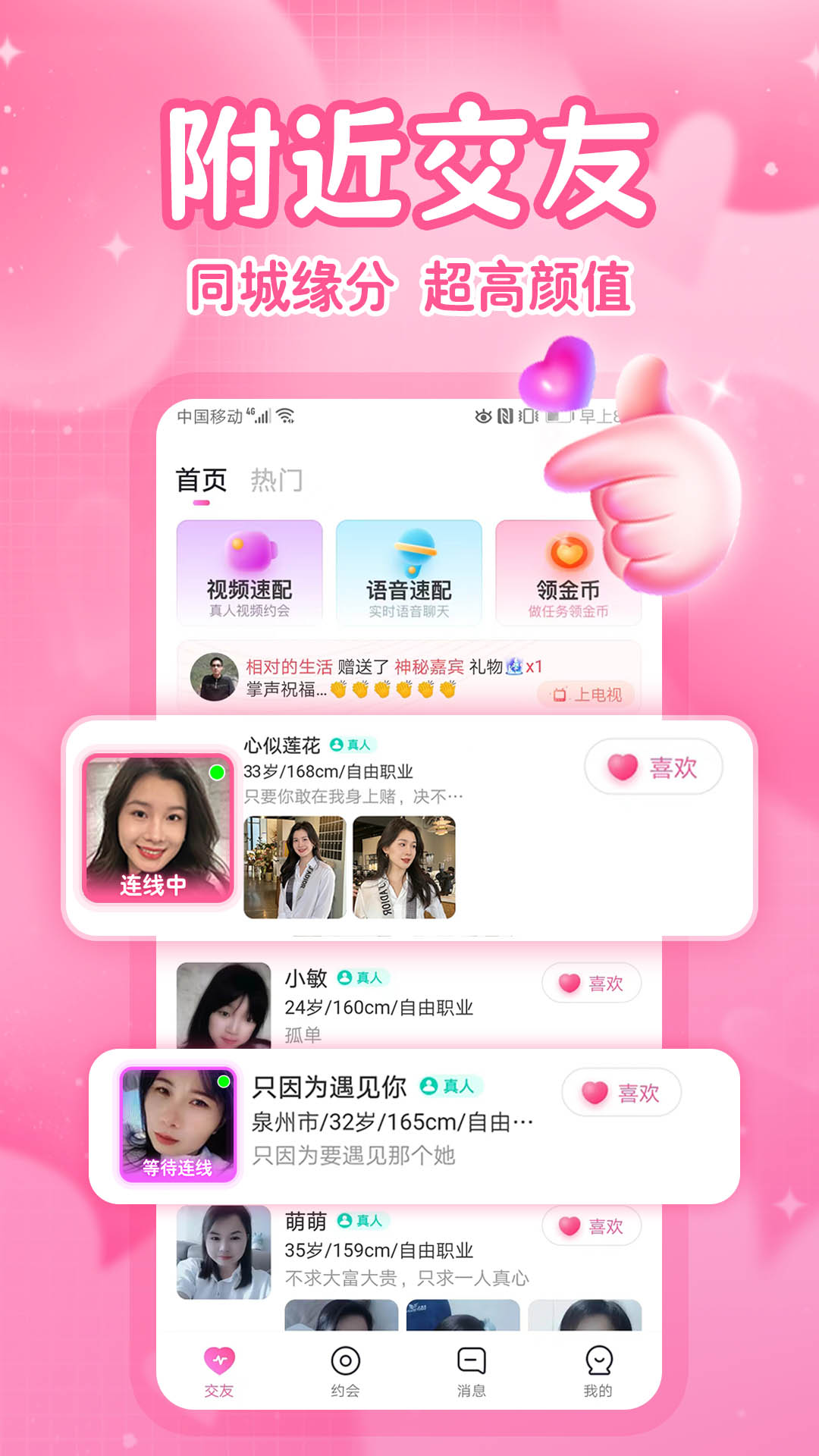 1、附近精准匹配:用户开启定位后,系统会自动筛选出周边5公里内的活跃用户,并根据性别、年龄、兴趣标签等条件进一步细化推荐,让每一次匹配都更贴近需求。