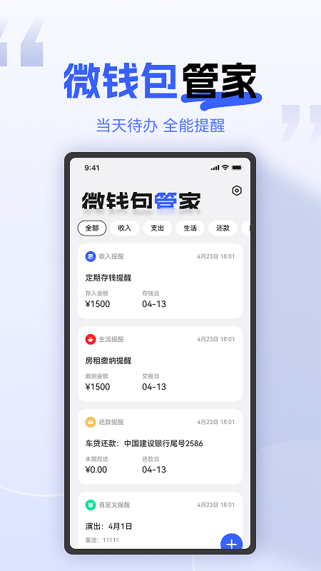 微钱包管家是一款以智能提醒为核心的个人财务管理工具,专为解决现代人收支混乱、还款逾期、资金规划不足等痛点设计。通过整合收支记账、还款提醒、日程管理、存钱计划定制等功能,用户可实现“收入早知晓、还款无逾期、生活零疏漏”的全方位财务守护。该应用支持工资到账提醒、信用卡/车贷/房贷还款提醒、手机充值提醒等高频场景,同时提供自定义提醒服务,满足个性化需求。其简洁的界面设计与跨平台兼容性(支持Android及iOS部分功能),让用户轻松掌握资金动向,逐步实现财富积累目标。