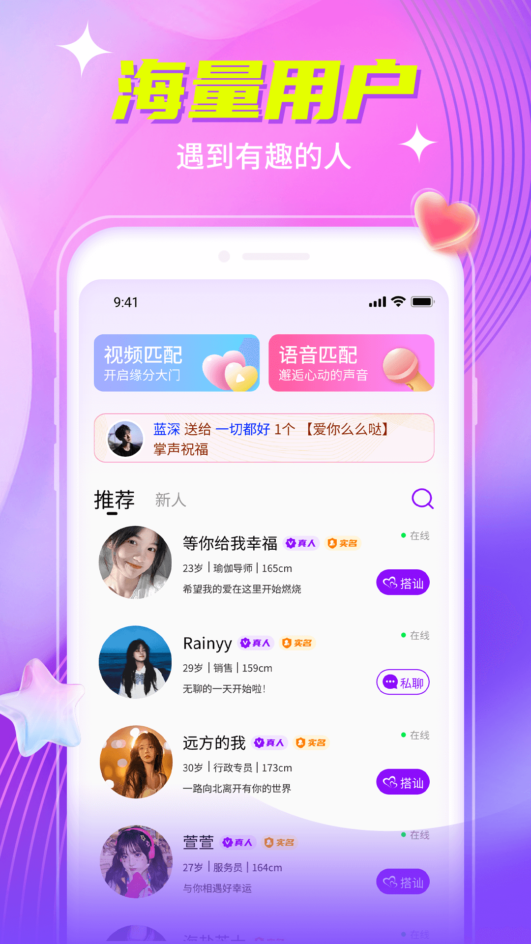 “偶遇”APP是一款专注于兴趣社交的移动应用,致力于为用户打造一个轻松、真实且充满惊喜的社交平台。通过智能算法匹配与地理位置定位,用户可以快速发现身边拥有共同兴趣爱好的人,无论是运动健身、音乐电影,还是读书旅行,都能在这里找到志同道合的伙伴。平台界面简洁清新,操作流畅,支持文字、语音、视频等多维度互动方式,让每一次“偶遇”都充满可能性。无论是想拓展社交圈、寻找活动搭子,还是单纯期待一场不期而遇的温暖,“偶遇”都能满足你的需求。