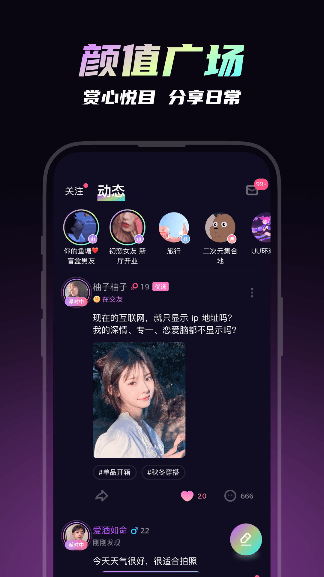 2、动态内容创作:支持图文、短视频、语音等多种形式发布动态,用户可自由添加滤镜、贴纸等特效,增强内容趣味性。动态页面还设有“互动问答”功能,促进用户间深度交流。
