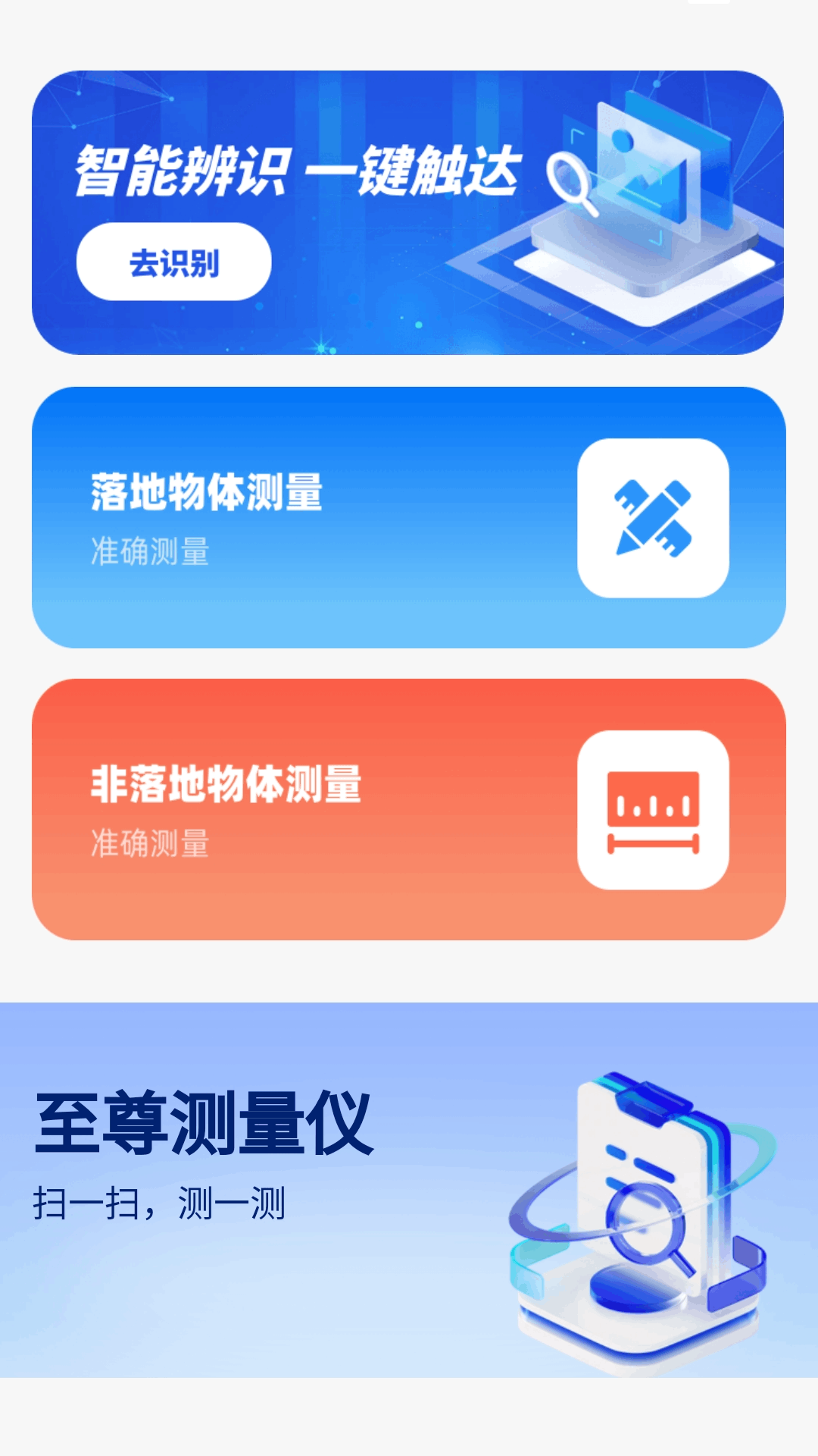 1、**基础功能全免费**:与同类工具相比,至尊测量仪将核心识别、测量功能设为免费,用户无需付费即可使用万物识别、智能测距、证件扫描等高频功能。这种“零门槛体验”策略,降低了用户尝试成本,使其在应用市场同类产品中脱颖而出。据统计,免费版用户次日留存率达65%,远超行业平均水平。
