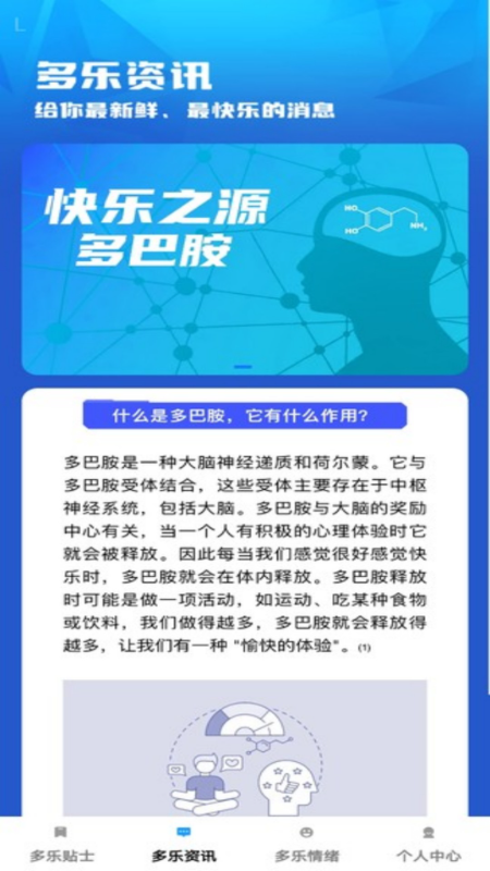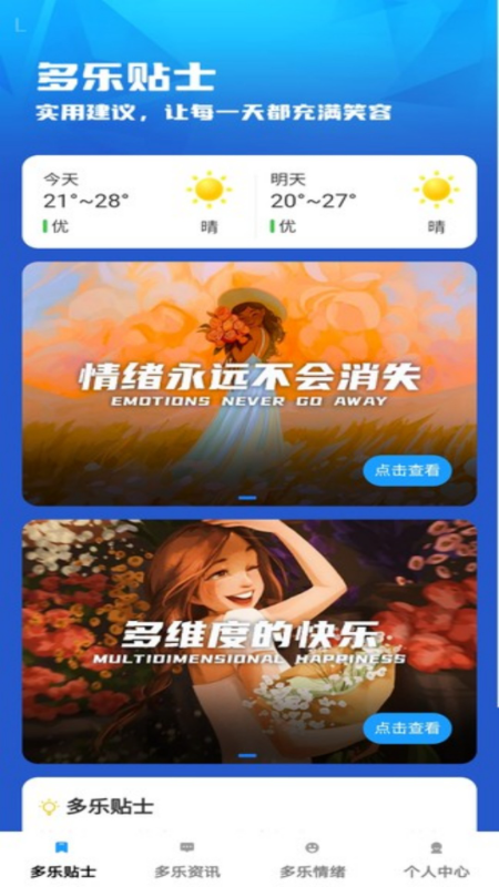 多乐冲冲是一款以提升生活品质和情绪管理为核心的实用型APP,通过整合天气预报、生活贴士、资讯百科及情绪管理工具,帮助用户在快节奏生活中找到平衡点。其界面设计简洁直观,功能模块清晰分类,既提供实时天气数据与出行建议,又涵盖科技、健康、文化等领域的深度资讯,更通过情绪记录与分析功能,引导用户科学调适心理状态。无论是规划日常行程、拓展知识视野,还是缓解压力焦虑,多乐冲冲都能成为用户的“生活智慧助手”,让快乐与效率并存。